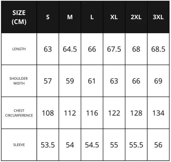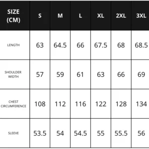 Sizes: S, M, L, XL, XXL, 3XL